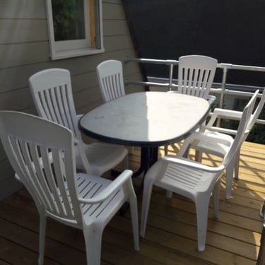 2 zonneterrassen (vooraan EN achteraan, beide toegankelijk via binnen en aparte buitentrap), hierdoor kunnen jullie in de voormiddag vooraan genieten van de zon, in de namiddag/avond achteraan. Tuintafel, tuinstoelen en parasol (in de winter staan deze in tuin/berging)