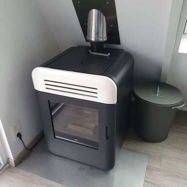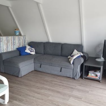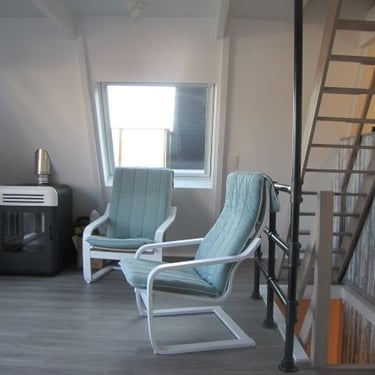 leefruimte, verwarmd met pelletkachel (steeds gevuld door ons en 1 zak pellets beschikbaar, extra pellets kunnen aangekocht worden (in Colruyt/Hubo/….), 2 zetels, zetelbed voor 2 personen (in bergruimte ligt donsdeken en strips), 2 salontafeltjes (op wielen), TV, dvd-speler