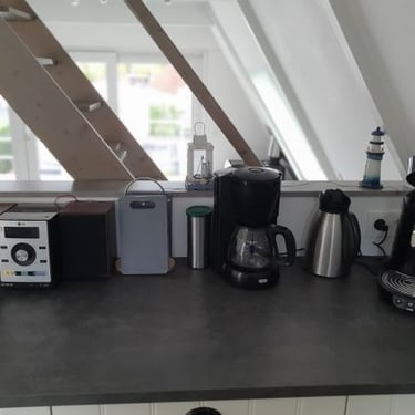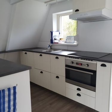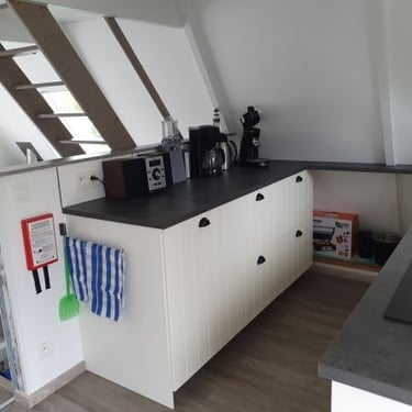 uitgeruste keuken met inductiefornuis, combi-oven / microgolfoven, frigo, vaatwasmachine, koffiemachine, senseo, broodrooster, toaster/grill, waterkoker, mixer, flessenkoeler, uitgebreid porselein, potten en pannen, slazwierder, vergiet, glazen en bestek voor 6 personen, wijn/bier/champagne/frisdrankglazen, koffieservies, snijplankjes, spatels, messen, dunschiller, plastiek zakken, rietjes, huishoudrol, aluminiumfolie, plastiekfolie, bakfolie, dienblad, vaatwasdoek & spons, keukenhanddoeken, afwasmiddel, vaatwastabletten, servietten, theelichtjes, lucifers, basis kruiden, radio met dvd-speler… o de tafeldiepvriezer staat in de inkom