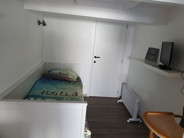 afzonderlijke kamer met eenpersoonsbed (80cm + eventueel uittrekbaar 2de bed) en TV - deze kamer is wel enkel via buitendeur (rechts onderaan op foto) toegankelijk (in deze ruimte bevindt zich ook de technische ruimte met meters (elektriciteit en water)