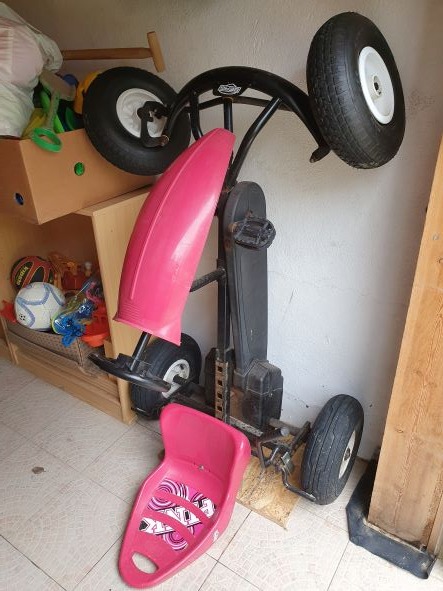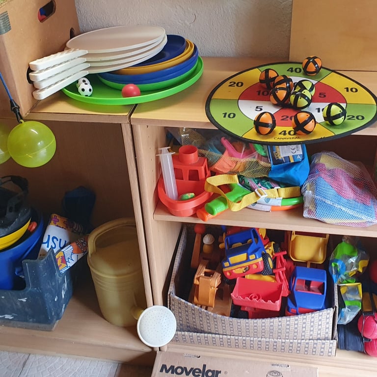 Gesloten tuinberging (voor bv fiets) met daarin BBQ, bolderkar, strandtent, strandmatje, strandspeelgoed, petanqueset voor kinderen en petanqueset voor volwassenen, tennisrackets, badmintonset, basketbal, voetbal, darts voor kinderen, pingpongbats en pingpongballetjes, balletjes voor tafelvoetbal (er is een pingpongtafel en kickertafel aan de ingang van het domein, links van inkom openluchtzwembad), gocart (gebruik enkel op domein toegestaan)