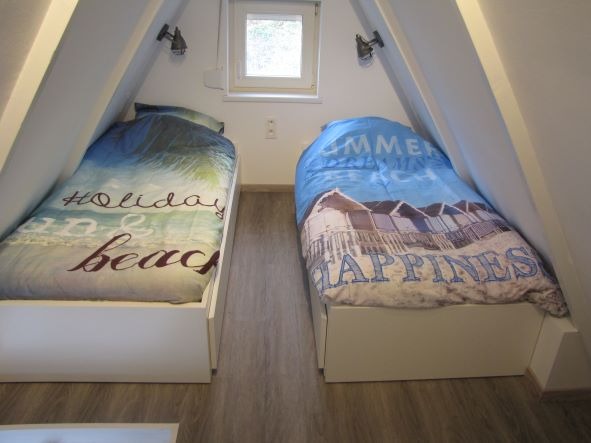 Slaapkamer 2 : 2 x éénpersoonsbed van 80 cm , donsdekens, kussens, dekbedovertrek-en kussenslopen voor elk bed + leeslampje aan beide zijdes