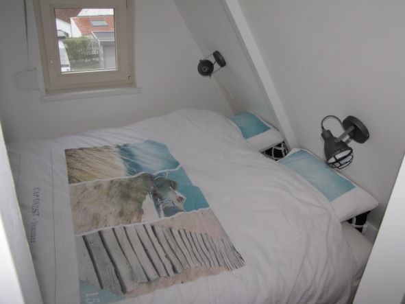 Slaapkamer 1: tweepersoonsbed 160 cm - donksdeken, kussens, dekbedovertrek en kussenslopen, met leeslampje aan beide zijdes